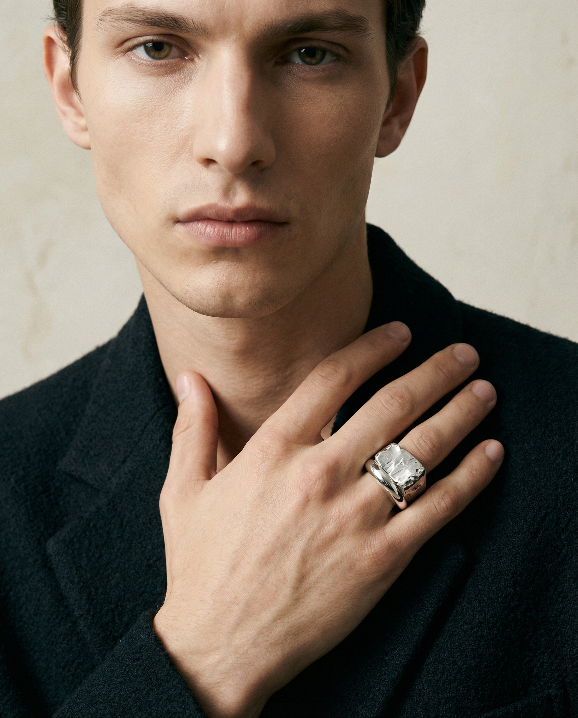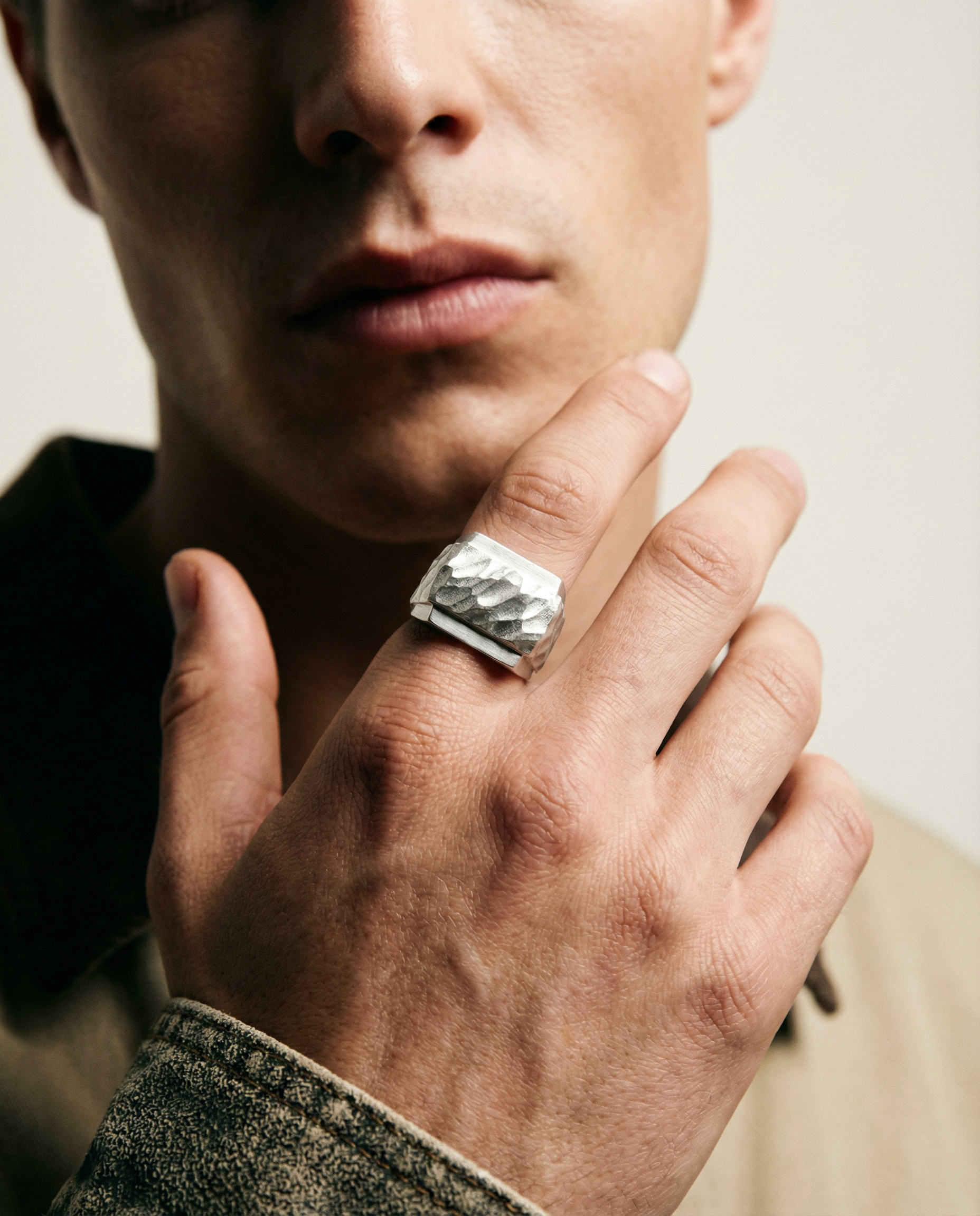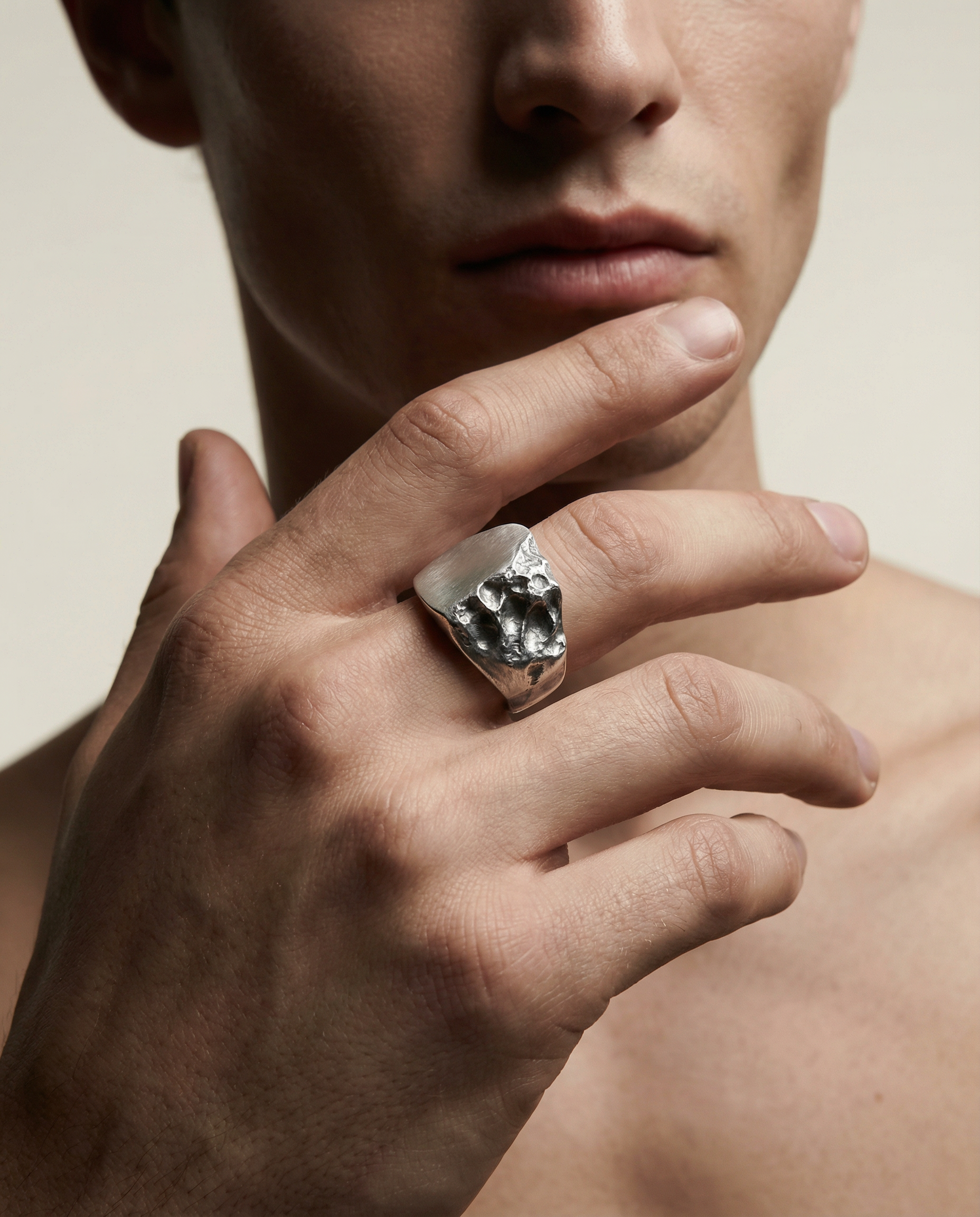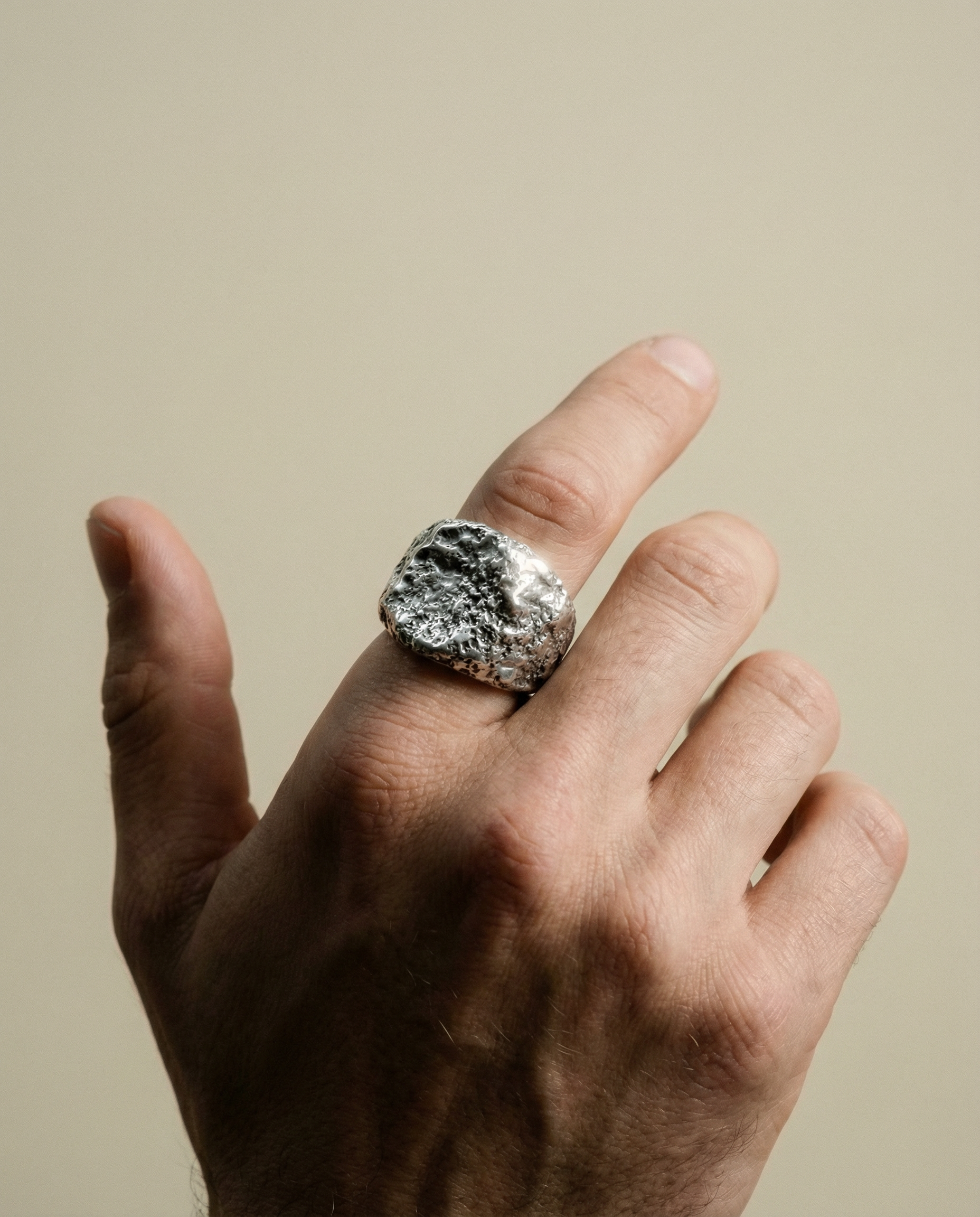 "This collection is an homage to the invisible forces that shape our world. Here, silver is not merely polished; it is weathered, carved, and eroded to reveal the brutal beauty of imperfection. Every piece in the Raw & Eroded series is a geological exploration. Inspired by rugged cliffs, dry riverbeds, and tectonic pressure, these jewels capture the moment raw matter becomes a relic. Hand-sculpted in Denmark, each ring and cuff features a unique topography of craters, fissures, and ridges."