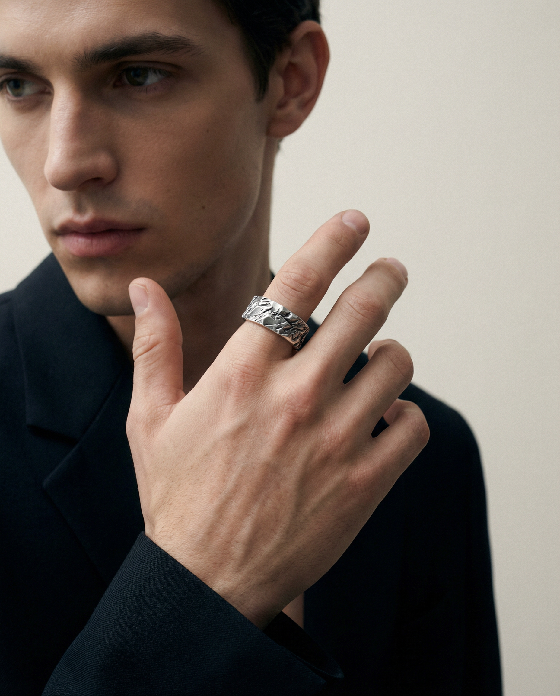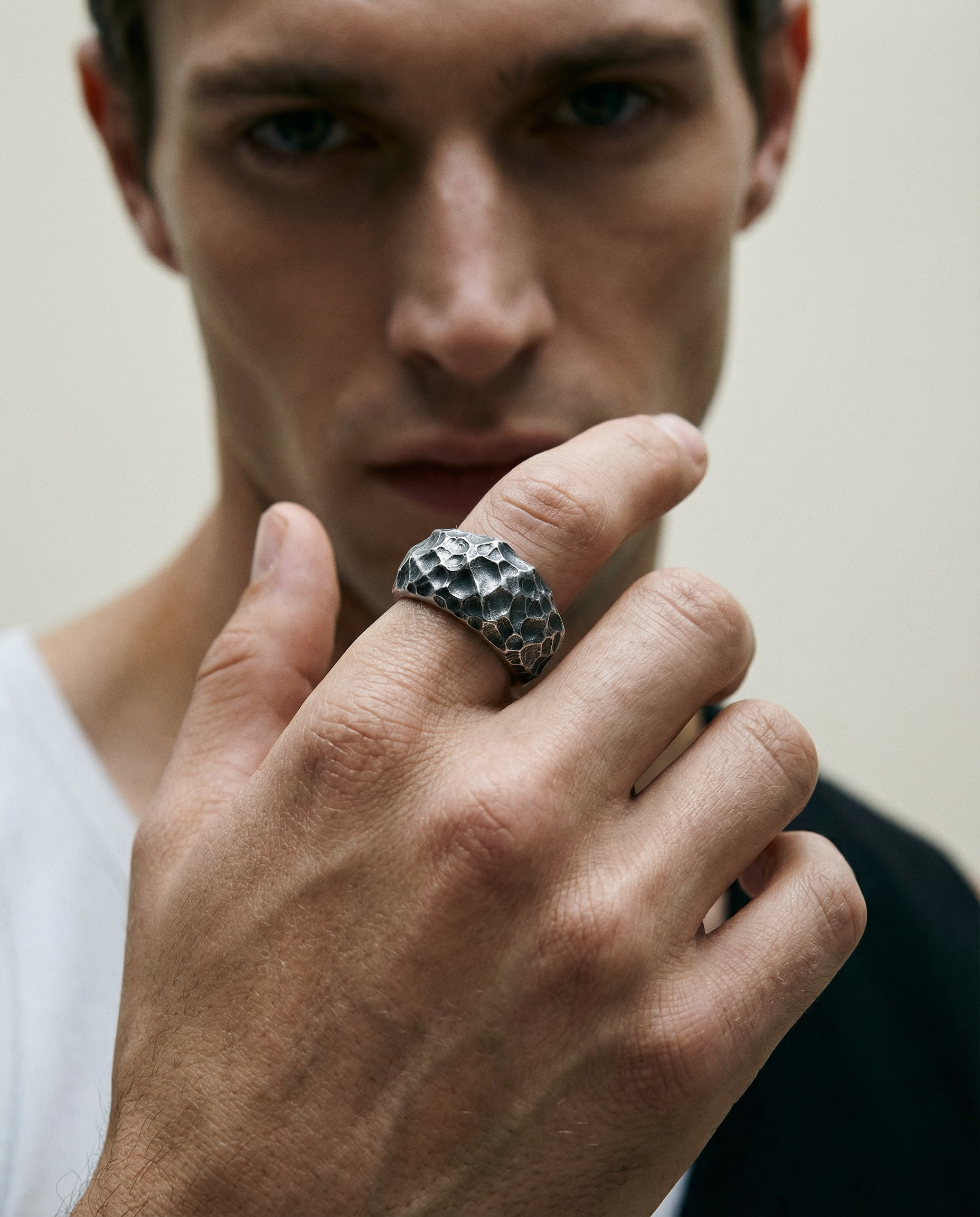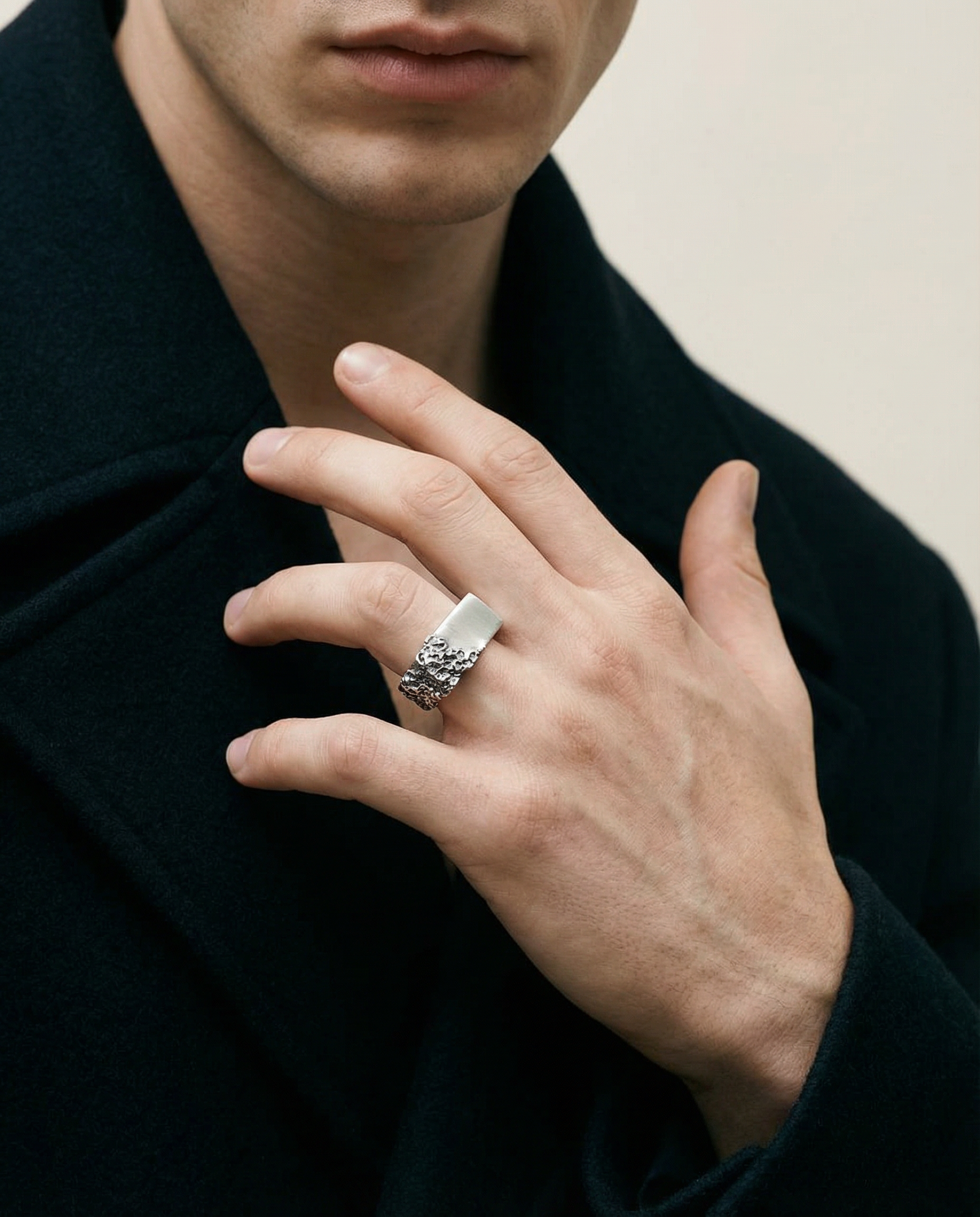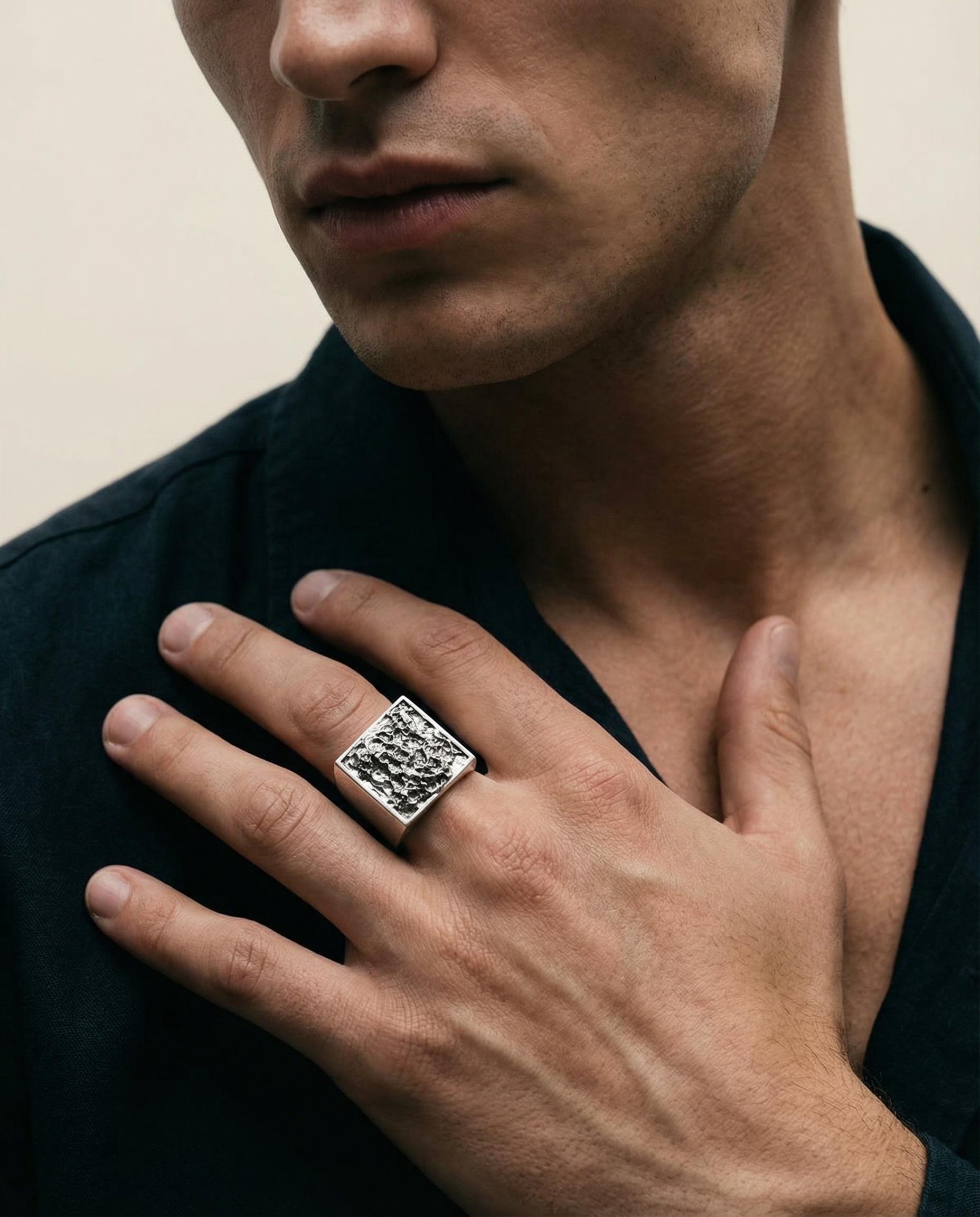 "This collection is an homage to the invisible forces that shape our world. Here, silver is not merely polished; it is weathered, carved, and eroded to reveal the brutal beauty of imperfection. Every piece in the Raw & Eroded series is a geological exploration. Inspired by rugged cliffs, dry riverbeds, and tectonic pressure, these jewels capture the moment raw matter becomes a relic. Hand-sculpted in Denmark, each ring and cuff features a unique topography of craters, fissures, and ridges."